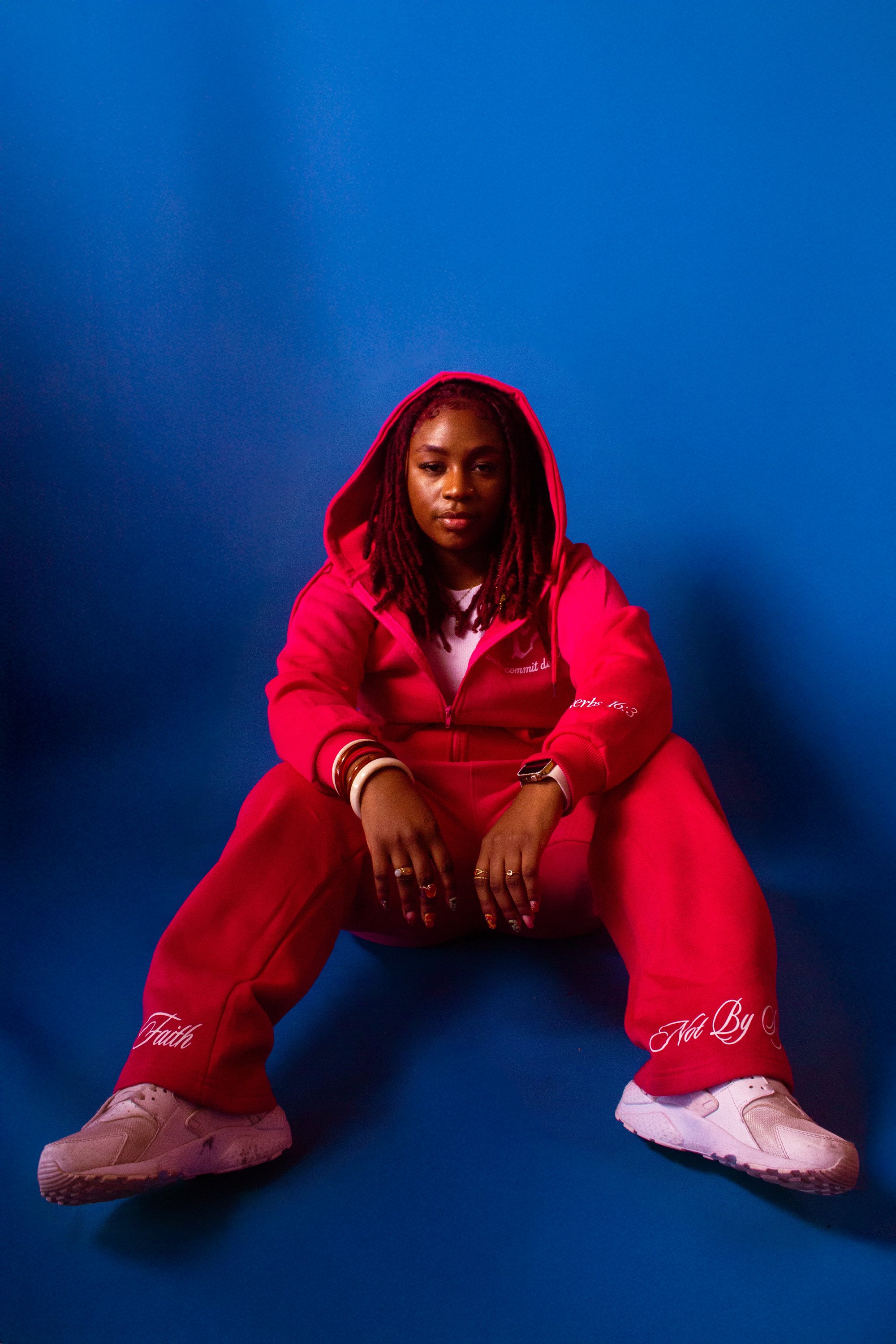 - "Walk By Faith" & "Not by Sight" at bottom opening of sweatpants